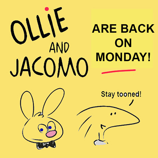 I will be taking a break from my daily Tomversation cartoons and spending time with Ollie and Jacomo.