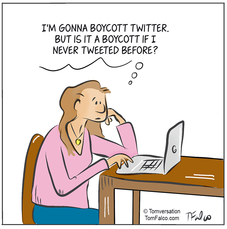 Boycott Twitter? Published here daily/also here: Facebook.com/Tomversation.toons Instagram.com/tomversation.toons Read my blog: Tomversation.com Subscribe via email here Sharing is caring Click to share on LinkedIn (Opens in new window) LinkedIn Click to share on Facebook (Opens in new window) Facebook Click to share on Pinterest (Opens in new window) Pinterest Click to share on Tumblr (Opens in new window) Tumblr Click to share on Reddit (Opens in new window) Reddit Click to share on X (Opens in new window) X Click to email a link to a friend (Opens in new window) Email Like Loading... Related