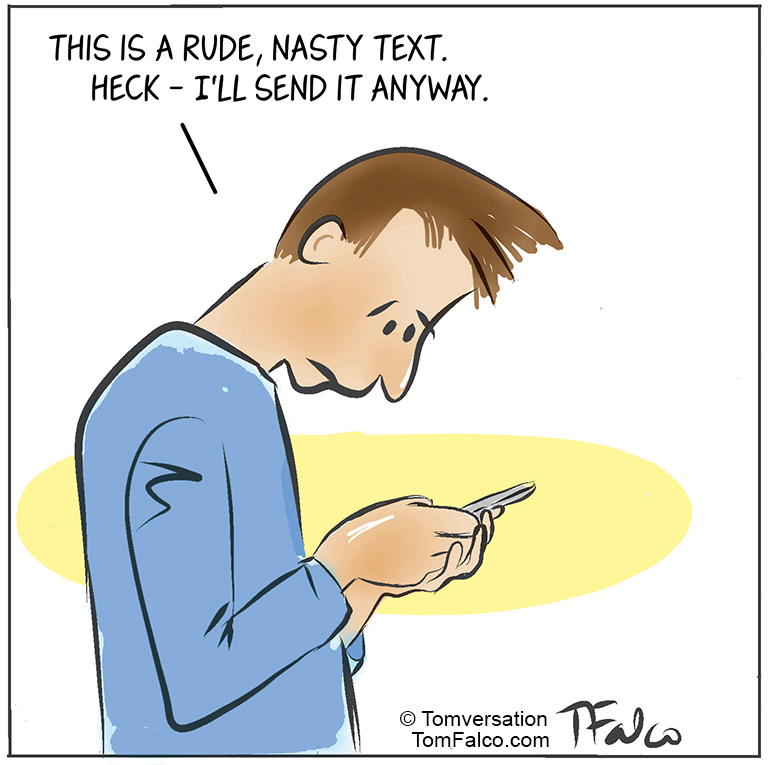 Rude, nasty text Published here Mon-Fri / also here: Facebook.com/Tomversation.toons Instagram.com/tomversation.toons Read my blog: Tomversation.com Subscribe via email to this daily comic here Sharing is caring Click to share on LinkedIn (Opens in new window) LinkedIn Click to share on Facebook (Opens in new window) Facebook Click to share on Pinterest (Opens in new window) Pinterest Click to share on Tumblr (Opens in new window) Tumblr Click to share on Reddit (Opens in new window) Reddit Click to share on X (Opens in new window) X Click to email a link to a friend (Opens in new window) Email Like Loading...