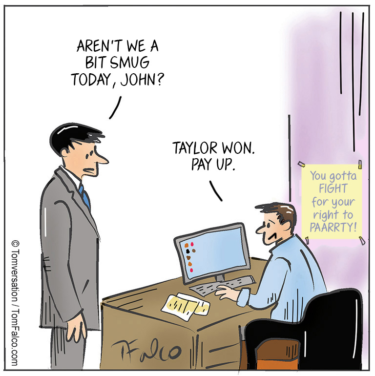 The bet Published here Mon-Fri / also here: Facebook.com/Tomversation.toons Instagram.com/tomversation.toons Read my blog: Tomversation.com Subscribe via email to this daily comic here Sharing is caring Click to share on LinkedIn (Opens in new window) LinkedIn Click to share on Facebook (Opens in new window) Facebook Click to share on Pinterest (Opens in new window) Pinterest Click to share on Tumblr (Opens in new window) Tumblr Click to share on Reddit (Opens in new window) Reddit Click to share on X (Opens in new window) X Click to email a link to a friend (Opens in new window) Email Like Loading... Related