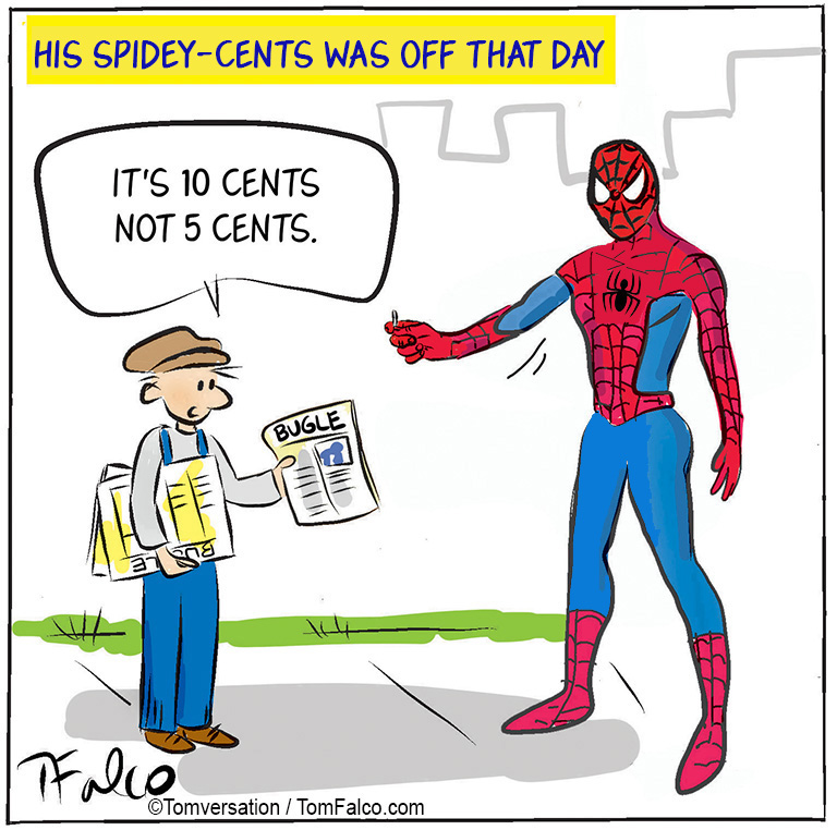 Spidey cents Published here Mon-Fri / also here: Facebook.com/Tomversation.toons Instagram.com/tomversation.toons Read my blog: Tomversation.com Subscribe via email to my daily cartoon here Sharing is caring Click to share on LinkedIn (Opens in new window) LinkedIn Click to share on Facebook (Opens in new window) Facebook Click to share on Pinterest (Opens in new window) Pinterest Click to share on Tumblr (Opens in new window) Tumblr Click to share on Reddit (Opens in new window) Reddit Click to share on X (Opens in new window) X Click to email a link to a friend (Opens in new window) Email Like Loading...
